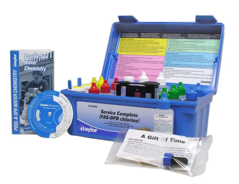 The Taylor K2006C Complete High Range Alkalinity and Chlorine FAS-DPD/CYA/Hardness/pH Test Kit includes everything you need for accurate readings of total alkalinity, free and combined chlorine, cyanuric acid, calcium hardness, and pH. The K2006C features distinct color changes to eliminate guessing and 2 oz. easy application bottles for accurate treatment doses.