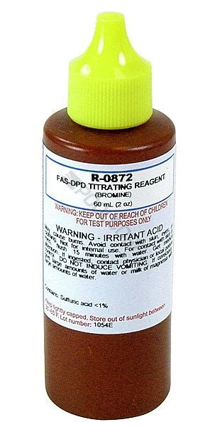 The Taylor R-0872-C FAS-DPD Bromine Titrating Reagent 2 ounce bottle is a direct replacement for FAS-DPD reagents in Taylor test kits. Test kit reagents should be stored in a cool, dry place out of direct sunlight and should be replaced at least annually.